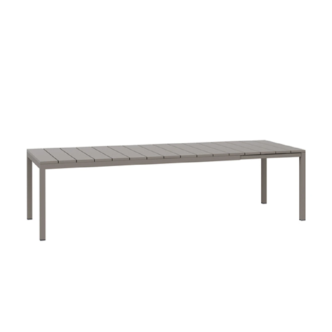 Mesa extensible desde 210 a 280cm con tablero DurelTOP en polipropileno tratado anti UV y teñido en masa. Estructura en aluminio pintado con pies regulables.