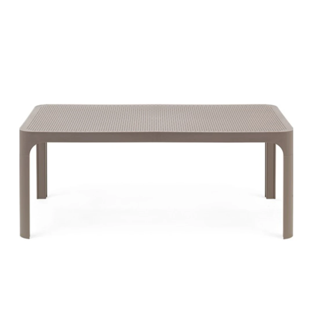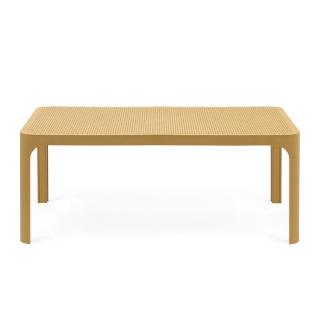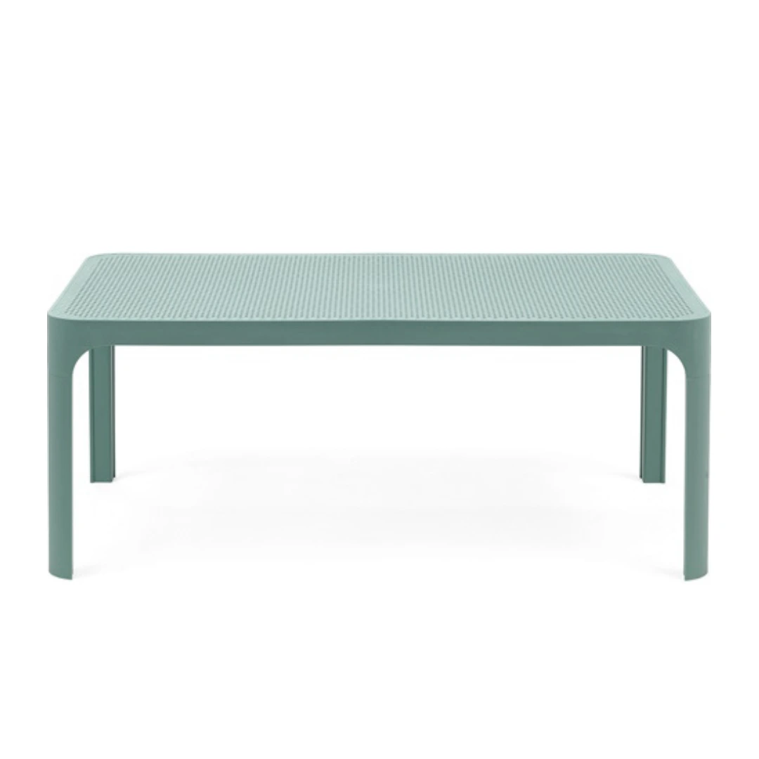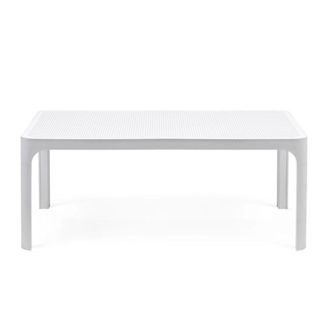 Mesa baja de 100×60 cm, en polipropileno fiberglass tratado anti UV y teñido en masa. Desmontable. Dotado de tacos antideslizantes. Ideal para formar el juego de sala junto con la Net Bench y los sillones Net Relax.