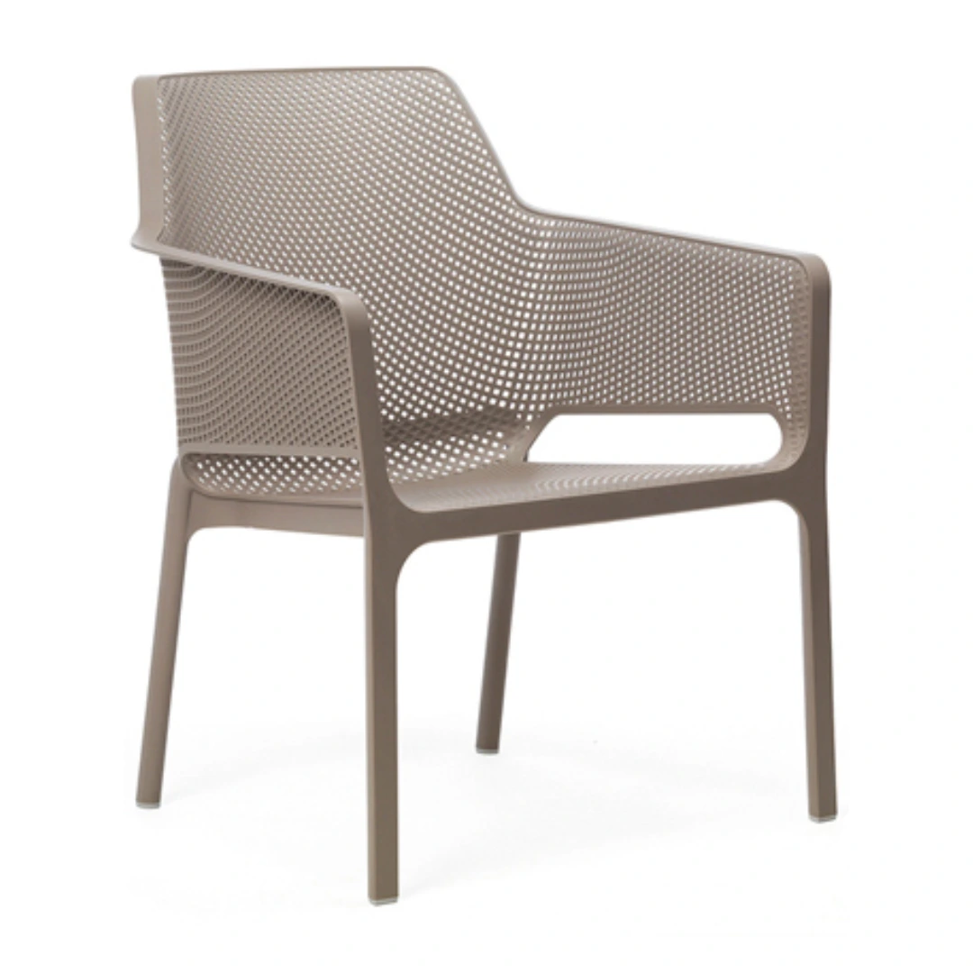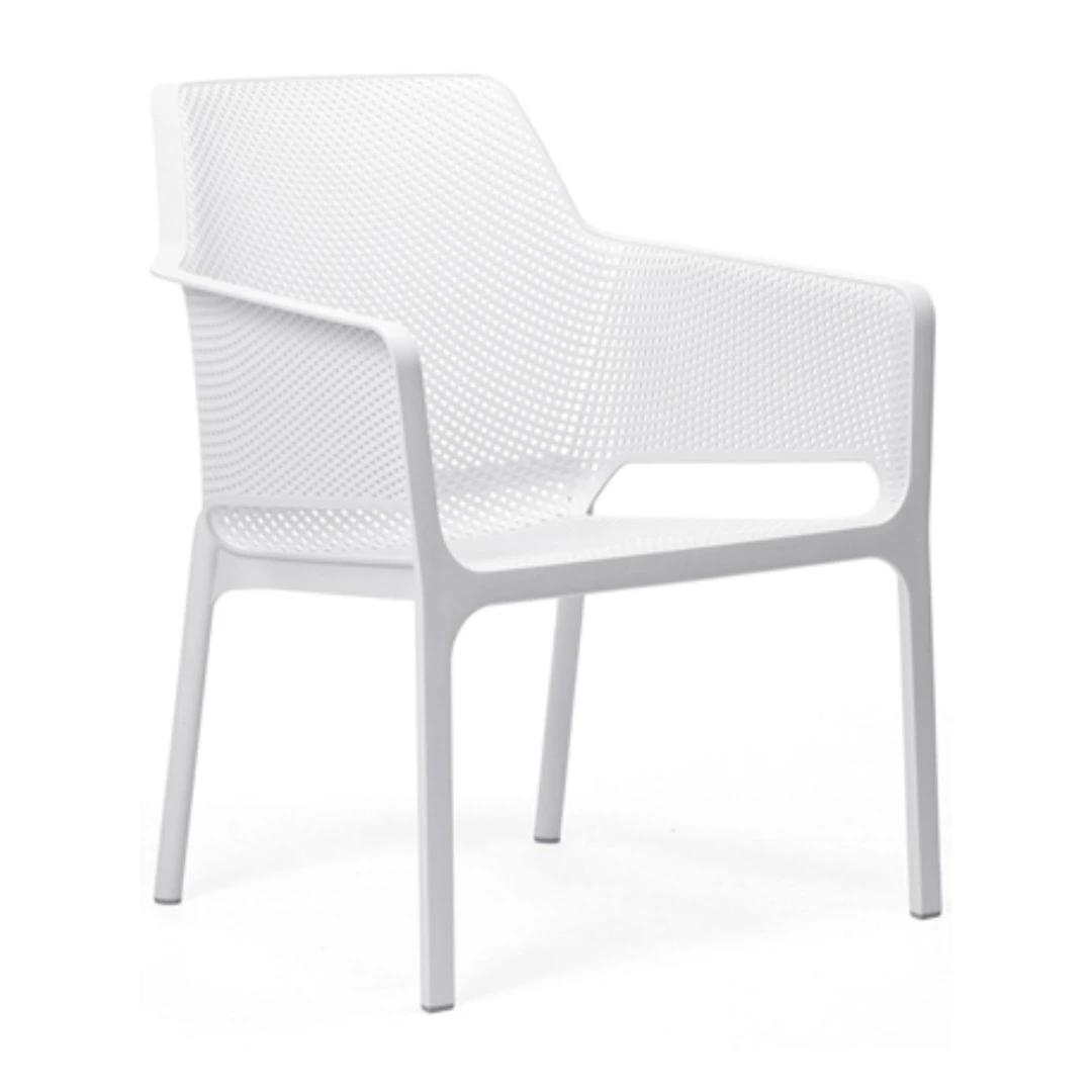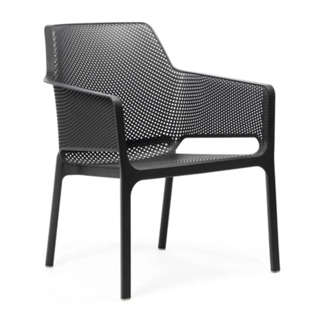 Sillón apilable con brazos, en polipropileno fiberglass tratado anti UV y teñido en masa, tacos antideslizantes y efecto mate.