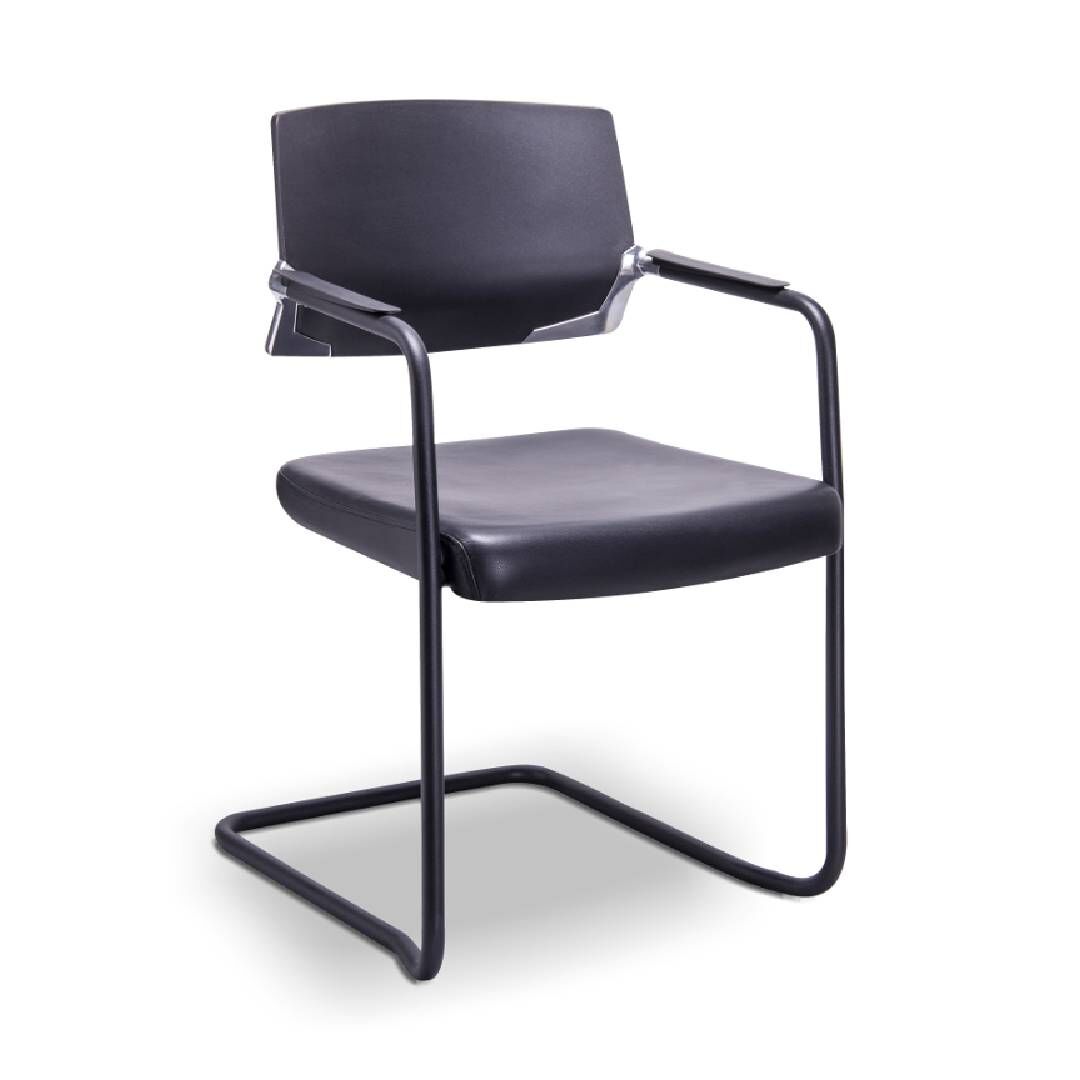 Silla de visita de la familia cool. Cuenta con diseño ergonómico en su respaldo elaborado en polipropileno y asiento tapizado en piel. Su base es de acero tubular redondo cal. 13 en forma de trineo terminado en color negro.
