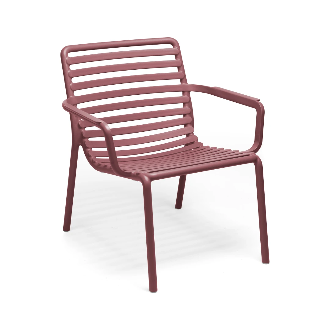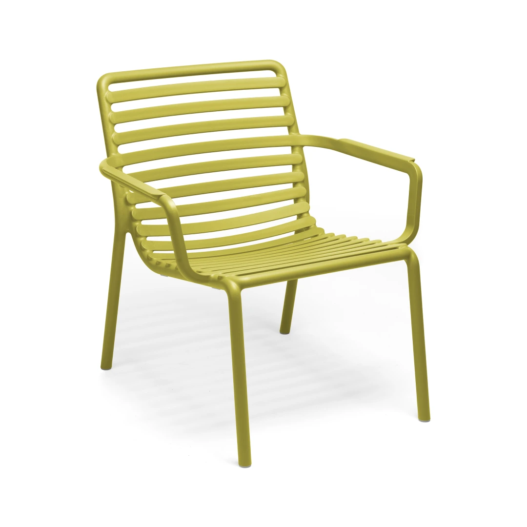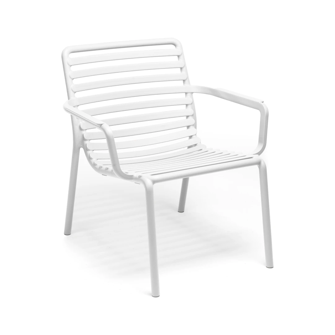 Doga Relax es el nuevo sillón de exterior fabricado por la firma italiana Nardi, está hecho de resina reforzada con fibra de vidrio. Es amplio, cómodo  y con una ligera inclinación hacia atrás. Se distingue por un juego de espacios llenos y vacíos creado por la secuencia de pentagramas horizontales. Apilable, fácil de limpiar y reciclable.