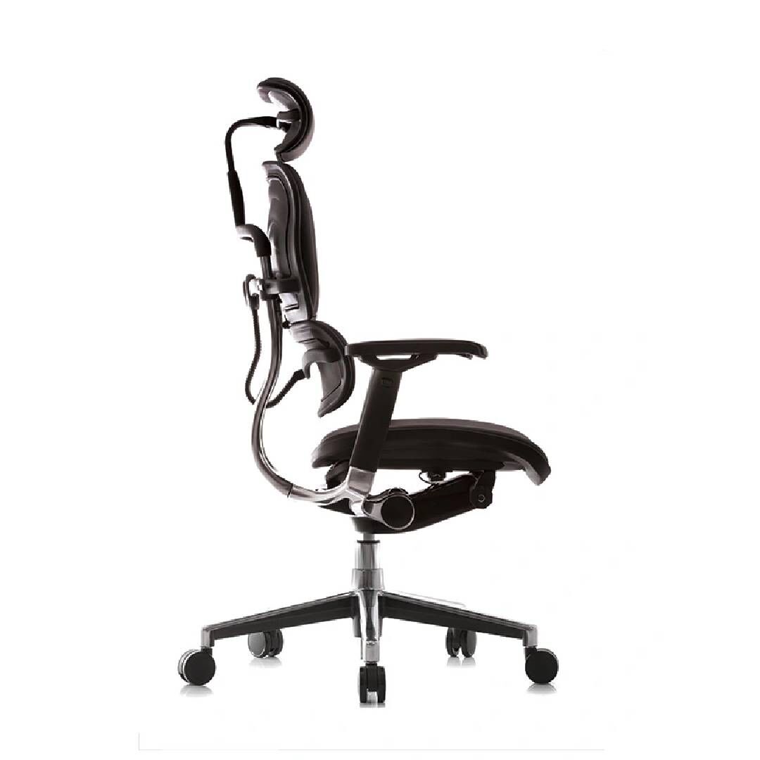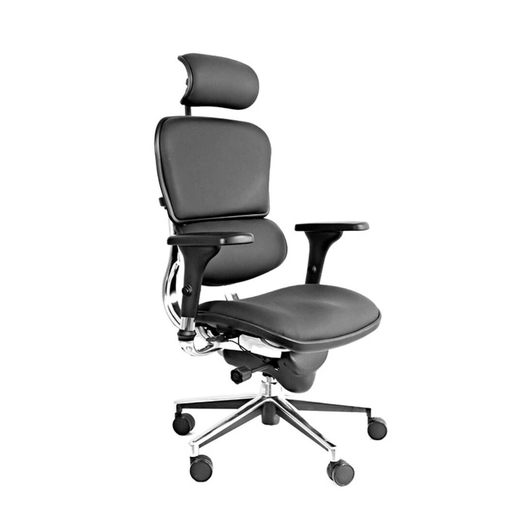 Sillón presidencial respaldo alto en piel color negro. Cuenta con asiento y respaldo ergonómico con reclinamiento synchro con un maneral para regular la tensión y 3 posiciones de bloqueo y sistema antishock, además cuenta con sistema slider para ajuste de profundidad de asiento y altura de respaldo con soporte lumbar flotante. Su cabecera es ajustable a 3 posiciones y descansa brazos 3D ajustables. Base de 5 puntas fabricada en aluminio pulido con parte interna terminada en pintura color negro.
